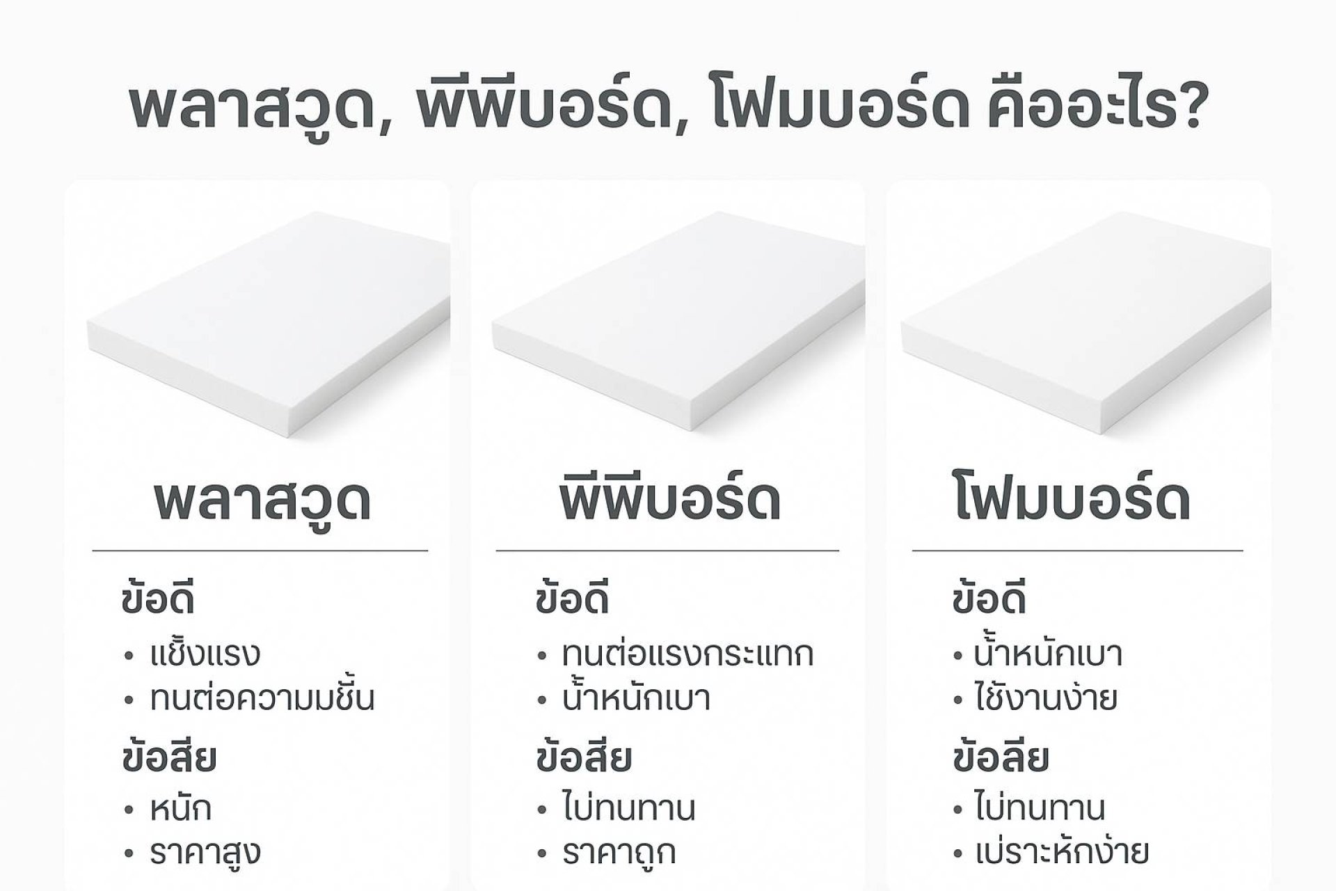 เปรียบเทียบวัสดุป้ายยอดนิยม: พลาสวูด vs พีพีบอร์ด vs โฟมบอร์ด เลือกแบบไหนเหมาะกับงานของคุณ?