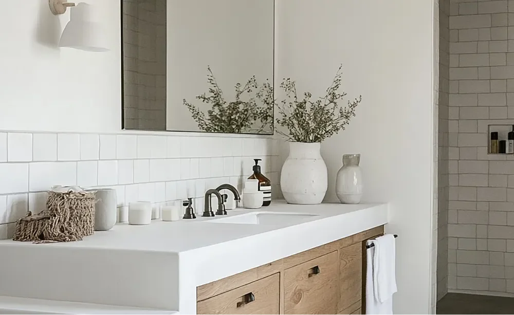 Clean, minimalistic design with a focus on light, neutral colors, and natural materials like wood and stone.